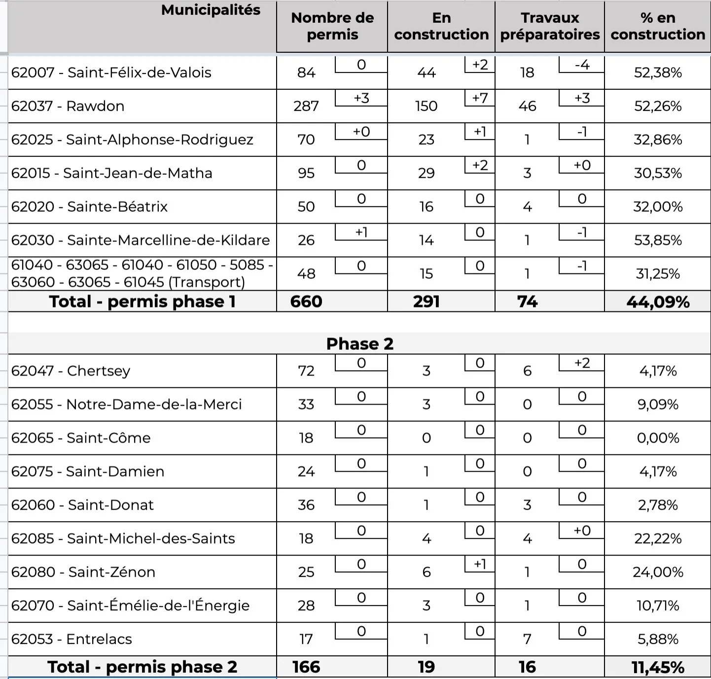 Nous avons de plus en plus de permis de construction pour l’ensemble de la MRC. Nous continuons nos rencontres tripartites avec Bell Canada et Hydro-Québec.